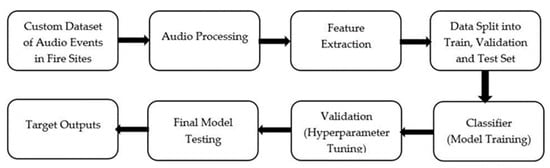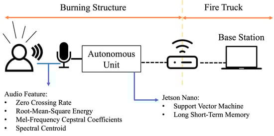 As the first responders at a burning site, the firefighters’ main task is to evacuate victims from the site to safety. The danger level associated with this task is extremely high. Data shows that hundreds of firefighters have lost their lives on duty [3]. Therefore, it is imperative to guide the firefighters with appropriate information that will help them effectively carry out the evacuation process considering the safety of both the victims and firefighters. Autonomous data collection during fire emergencies also saves valuable time by using intelligent firefighting techniques shown in [4,5]. Researchers continually improve the firefighting technique with the latest technologies where Artificial Intelligence (AI) comes into play [6,7,8]. Other research is ongoing on firefighting robots [4,9] and on improving the quality of sensors and firefighting equipment [10,11]. The research work in [12] deals with the design of an autonomous embedded system vehicle (AESV) equipped with various sensors, including LiDAR, GPS, and Infrared (IR) camera, which can navigate autonomously into the burning sites, collect sensory data, and then transmit this information to the firefighters in the base station. The research work in [13] presented a deep learning model that can identify victims from IR images in burning sites. However, IR images cannot identify victims trapped inside a confined place. Additionally, a victim’s presence cannot be determined from IR images if a particular portion of the body structure is not visible. Since human nature is to scream and shout for help in such emergencies, these audio sources can be used alongside victim detection approach using IR images, which can play a vital role in detecting the victim in fire emergencies. The work in [14] developed a sound identification model for firefighting mobile robots. However, the work did not take the high noise level associated with a burning site into consideration.