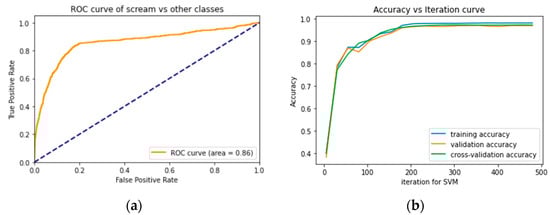 Support vector machine (SVM) is a supervised machine learning technique based on statistical learning theory, introduced by Cortes and Vapnik in 1995 [54]. The primary mechanism of SVM is to look for a hyperplane in an N-dimensional space to classify data points distinctly. A hyperplane is a decision boundary to optimize a plane with the maximum margin between data points from classes called support vectors. The previous research work on scream detection using SVM report high detection rate in noisy environments. SVM can typically be extended to multi-class classification [55]; thus, it is a suitable classifier for our multi-class problem. This classifier also efficiently handles non-linear data by applying different types of kernels as linear, polynomial, radial basis function (RBF), and sigmoid kernel.
