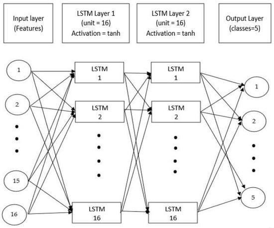 Long short-term memory (LSTM) networks are a recurrent neural network (RNN), which is efficient in learning order dependence in sequence prediction problems. To address the vanishing gradient problems of some RNN, the LSTM network was introduced to address this issue of RNN [58]. LSTM cells are compiled of multiple gates: input gate (i), forget gate (f), output gate (o). The functionalities of these gates are as follows: forget gate suppresses irrelevant information while letting applicable information pass through, input gate takes part in updating the cell state, and output gates update the value of hidden units.