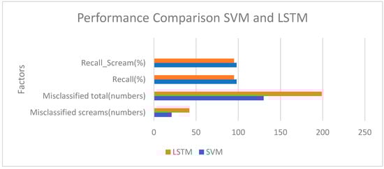 From Table 8 and Table 9, it is clear that both of the models depict high recall and lower misclassification for high SNR. In contrast to this, the performance of the models degrades for the lower SNR as the background noise gets prominent. At −10 dB SNR, SVM can accurately predict 91% of scream with only 9 misclassified scream samples out of 101 samples. However, for LSTM the performance goes down drastically with the decrease in SNR. The model can only predict 66% of scream correctly which is quite low compared with SVM.