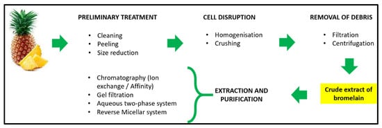 | Unconventional methods | Gel filtration Ion exchange chromatography Affinity chromatography Aqueous two-phase extraction Reversed micelle extraction | ↑ selectivity and purity of the final extract ↑ enzymatic yields ↓ number of processes for final bromelain extract ↑ efficacy of bromelain purification | ↑ costs of product recovery stability (?) |