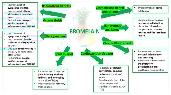 - Ley, C. A review of the use of bromelain in cardiovascular diseases. J. Chin. Integr. Med. 2011, 9, 702–710. [Google Scholar] [CrossRef] [PubMed]