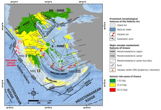 Map of the Hellenic Arc showing the location of the southern Ionian Islands at the northwesternmost part of the Hellenic Arc, along with the prominent morphological features of the Hellenic Arc and the major morphoneotectonic features based on Mariolakos and Papanikolaou [,] and the seismic risk zones of Greece. The southern Ionian Islands belong to the zone III of the current Greek Building Code with a peak ground acceleration (PGA) value of 0.36 g for a return period of 475 years.