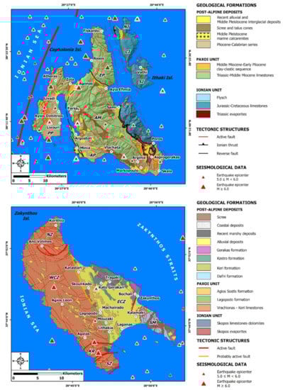 - Lekkas, E.; Danamos, G.; Mavrikas, G. Geological Structure and Evolution of Kefallonia and Ithaki islands. Bull. Geol. Soc. Greece 2001, 34, 11–17. [Google Scholar] [CrossRef]