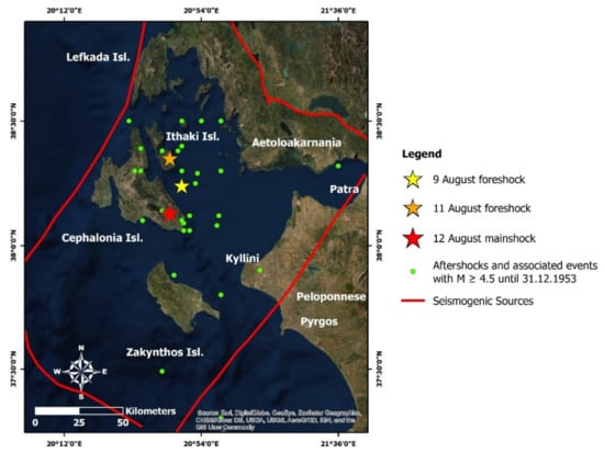 The August 1953 Ionian Sea sequence in the southern Ionian Islands was comprised of a series of devastating earthquakes, the largest of which was generated on 12 August with Ms = 7.3 or Mw = 7.0 based on Makropoulos et al. [] (Figure 3). The earthquake generated on 9 August (09:41, local time, Ms = 6.1, Mw = 5.9) and on 11 August (05:32, local time, Ms = 6.8, Mw = 6.6) (Figure 3) are considered foreshocks. Before the foreshocks of the early August, an earthquake with Ms = 5.6 (Mw = 5.5) preceded on 22 July.