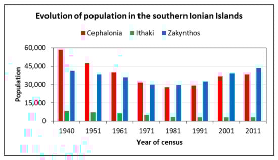 As regards the long-term earthquake-induced effects on the local population, the inability to financially support the local community resulted in waves of flight and migration both to the major urban centers of Greece and abroad. Based on population census data of the Hellenic Statistical Authority over a period of 30 years, from 1951 to 1981, the population of the three islands decreased from 92,706 in 1951 to 61,012 in 1981 (a decrease of 34.18%) (Figure 4).