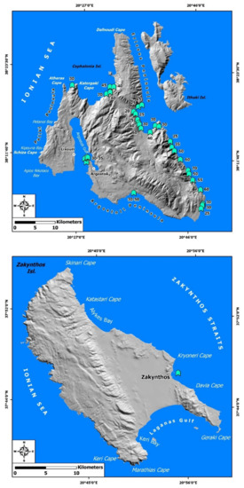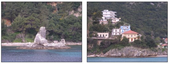 Moreover, Pirazolli et al. conducted an interdisciplinary study along the coasts of the Ionian Islands with scientists from various scientific fields, including geology, geomorphology, marine biology and archaeology []. They detected uplifted shorelines strongly related to seismotectonic processes and seismic events during the Holocene. As regards Cephalonia, they detected two vertical movements that have affected the island. The first was generated between 350 and 710 AD and the second in 1953; both resulted in the uplift of the southeastern part of Cephalonia.