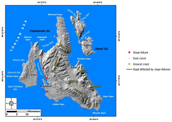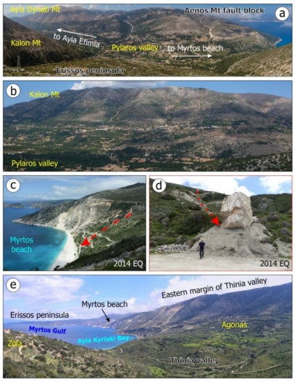 - Lekkas, E.L.; Mavroulis, S.D. Fault zones ruptured during the early 2014 Cephalonia Island (Ionian Sea, Western Greece) earthquakes (January 26 and February 3, Mw 6.0) based on the associated co-seismic surface ruptures. J. Seism. 2015, 20, 63–78. [Google Scholar] [CrossRef]