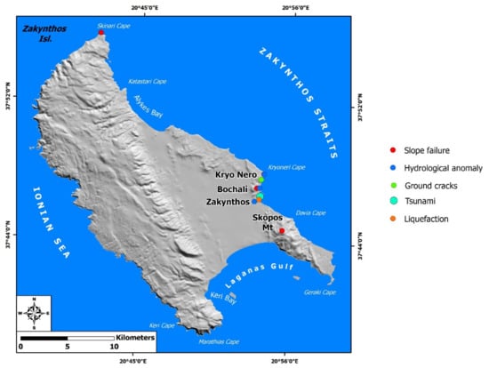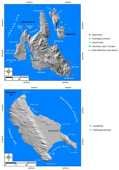 From the correlation of the inventory of the earthquake environmental effects and the susceptible zones, it is concluded that the majority of these effects were not randomly distributed in the affected islands but occurred in specific zones with characteristics and properties that made them susceptible to the occurrence of earthquake-related hazards. The zones affected by slope failures are characterized by intense morphology with high and steep slopes, attributed to strong uplift and intense incision. They are composed of various lithologies and are mainly located along marginal faults, which have contributed to a significant reduction of the mechanical strength of the faulted formations. The zones where liquefaction phenomena have occurred are found in coastal areas composed of recent deposits, particularly susceptible to such phenomena during strong earthquake ground motion. The zones affected the most by anomalous waves/tsunami were the coastal parts with funnel-shaped gulfs in the affected southern Ionian Islands. Large-scale tsunami and related effects were not generated on the coast, but anomalous waves with high potential for mild or moderate effects were triggered and reported in this strike–slip environment. Onshore hydrological anomalies were identified in water bodies, including lakes and in ground water extraction works, such as wells in residential and rural areas, which indicated a wide earthquake-induced disturbance of the aquifer.