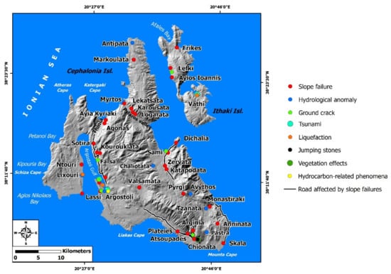 It is important to mention that contemporary sources, such as national and local newspapers, as well as the report of IGUR [], from which information about the earthquake environmental effects were extracted, did not include data on primary effects. The permanent coseismic uplift, which occurred mainly in the eastern part of Cephalonia, was not detected by the local population, as it neither had any immediate impact on buildings and infrastructure of the island, nor directly caused fatalities or injuries.