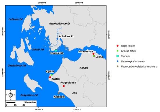 This information was added and edited in a database specially developed in Geographic Information Systems (GIS) environment to meet this study’s aims. This database includes data referring to the locations of the induced effects, their types and quantitative information—when available—about the primary earthquake environmental effects, such as the amount of permanent coseismic coastal uplift, the length of ground cracks, and the total volume of mobilized material, among other parameters.