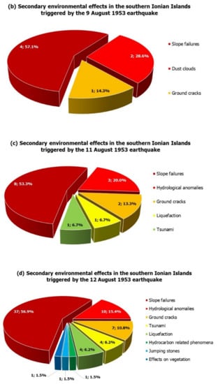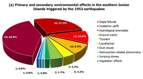 All these sources have been reviewed with emphasis on the primary (surface faulting and permanent surface deformation) and secondary effects (ground cracks, slope failures, liquefaction phenomena, anomalous sea waves/tsunami, hydrological anomalies, effects on vegetation, jumping stones and dust clouds) induced by the 9, 11 and 12 August 1953 earthquakes in the southern Ionian Islands, which suffered most from it. Based on the description of the earthquakes’ impact on the natural environment, qualitative and quantitative information of these effects were extracted. The recorded information was classified into primary and secondary earthquake environmental effects based on the classification proposed by Michetti et al. [] in the Environmental Seismic Intensity (ESI 2007) scale. Primary earthquake environmental effects are directly linked to the earthquake energy and, in particular, to the surface expression of the seismogenic source, comprising coseismic ruptures and permanent coseismic surface deformation, including uplift and subsidence []. Secondary earthquake environmental effects are any phenomena induced by the ground shaking and are classified into eight main categories: (1) hydrological anomalies, (2) anomalous waves/tsunamis, (3) ground cracks, (4) slope movements, (5) trees shaking, (6) liquefactions, (7) dust clouds and (8) jumping stones [].