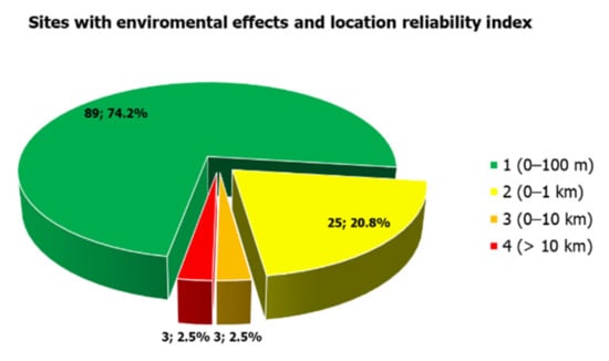Taking into account that there was no detailed information about the exact location of several effects, it appeared necessary to use a location reliability index (LRI). LRIs have been also used for other earthquakes and their effects on the environment, for example the 28 December 1908 Mw = 7.1 Messina (Italy) earthquake, studied by Comerci et al. []. In the case of the August 1953 earthquake sequence, the used LRI includes four classes of location approximation: (1) 0–100 m, (2) 0–1 km, (3) 0–10 km and (4) <10 km. The LRI was assigned to each primary and secondary earthquake environmental effects documented by this study.