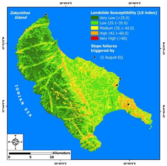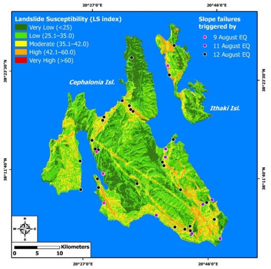 - Mavroulis, S.; Diakakis, M.; Kotsi, E.; Vassilakis, E.; Lekkas, E. Earthquake-induced landslide inventory and landslide suscep-tibility mapping for the Ionian Islands. In Proceedings of the 12th International Conference of the Hellenic Geographical Society, Athens, Greece, 1–4 November 2019. [Google Scholar]