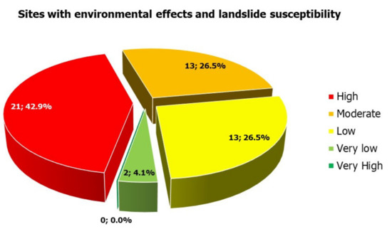 Pie chart showing the distribution of sites affected by slope failures triggered by the 12 August 1953 mainshock and its foreshocks on 9 and 11 August in zones of landslide susceptibility in the affected southern Ionian Islands.