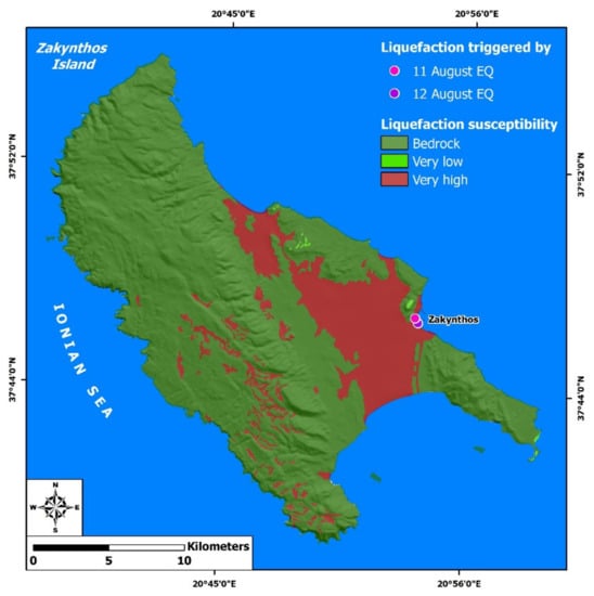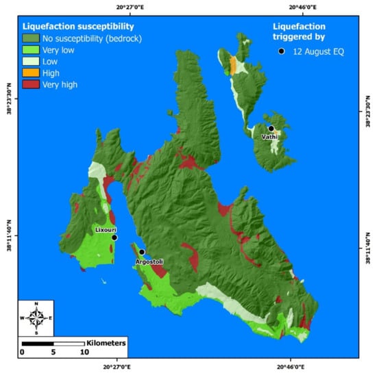 As regards the distribution of liquefaction phenomena, the liquefaction susceptibility maps of the Ionian Islands prepared for the “Telemachus” project [] and updated by Mavroulis [] were used. The classification of the geological formations into zones susceptible to liquefaction was based on geological criteria, including the age and the depositional environment of the formations and seismological criteria comprising the peak ground acceleration (PGA). The geological formations of the southern Ionian Islands were classified into five categories [,] (Figure 19): (1) The very highly susceptible to liquefaction deposits comprised of Late Holocene deposits in areas with PGA equal to 0.36 g, Late Holocene and Holocene deposits in areas with PGA equal to 0.24 g and 0.36 g respectively and deposits in areas with a history of earthquake-induced liquefaction occurrence. (2) The highly susceptible to liquefaction deposits comprised of Late Holocene and Holocene deposits in areas with PGA equal to 0.24 g and 0.36 g respectively characterized by earthquake-induced liquefaction history. (3) The deposits of medium liquefaction susceptibility, including Late Holocene and Holocene deposits, in areas with PGA equal to 0.16 g and 0.24 g respectively. (4) The deposits of low liquefaction susceptibility comprised of Pleistocene deposits in areas with PGA equal to 0.36 and 0.24 g. (5) The deposits of very low liquefaction susceptibility comprised of Pleistocene deposits in areas with PGA equal to 0.16 g. Geological formations older than the Pleistocene are not susceptible to liquefaction []. A similar approach to this liquefaction-susceptibility mapping has been recently applied in areas with similar geological and seismological properties, namely the case of the coastal area of Durrës in Albania after the 26 November 2019, Mw = 6.4 earthquake [].