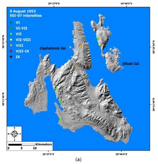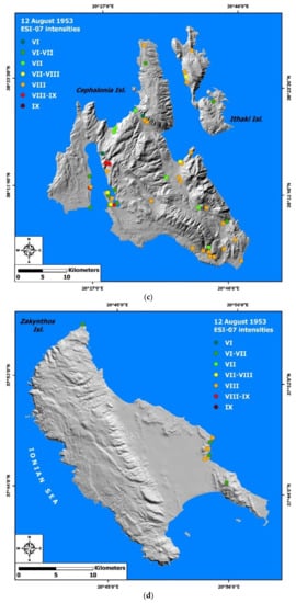 Environmental seismic intensities were assigned to all sites affected by environmental effects triggered by the mainshock of 12 August 1953 and its foreshocks on 9 and 11 August (Figure 20 and Figure 21), taking into account the available qualitative and quantitative information and the guidelines of Michetti et al. []. A table with all related information on the ESI-07 scale application is presented as Supplementary material (Table S1). This table has several fields, including the causative earthquake, the location of the induced effect, including the affected island, fault block and site, the category and the description of the induced effect, its impact on the built environment and on the local population, the respective ESI-07 intensity, the source of the information and its reliability index.