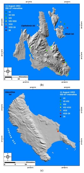 ESI-07 intensities for the secondary effects induced (a) by the 9 August 1953 earthquake in the Cephalonia and Ithaki islands and (b,c) by the 11 August 1953 earthquake in (b) Cephalonia and Ithaki as well as in (c) Zakynthos.