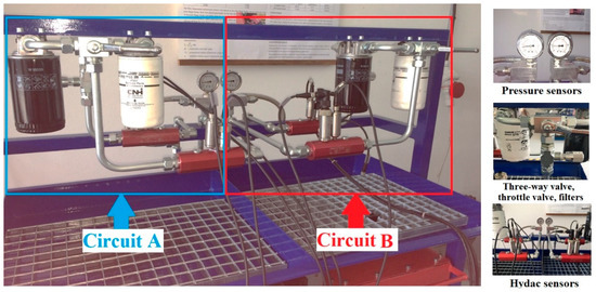 The measurement of quantities in the hydraulic system is performed by means of combined sensors, which enable the simultaneous measurement of pressure, temperature, and fluid flow at different types of oil filters and the degree of contamination of engine oil simultaneously in circuit A and B (Figure 2).