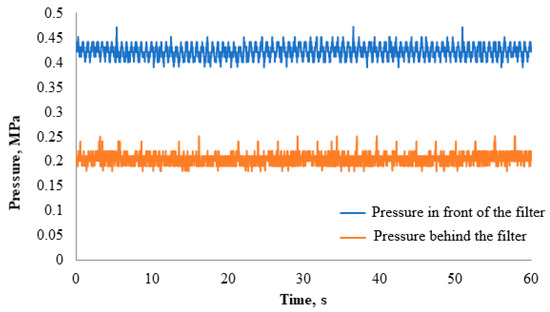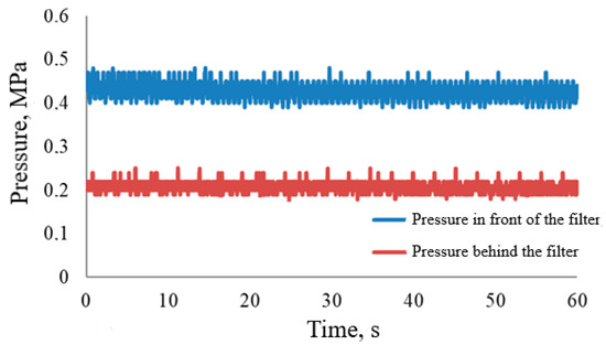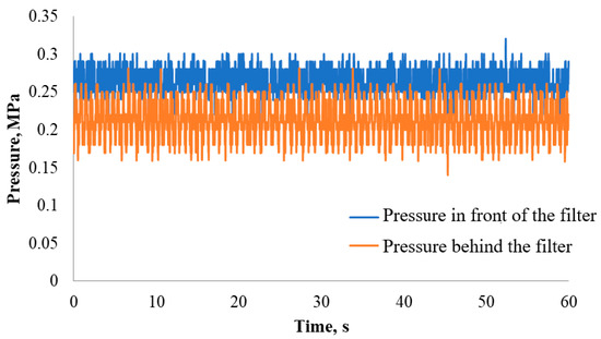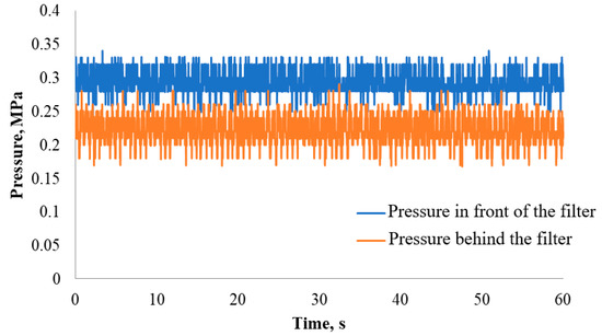 Verifying the measurement of the device for evaluating engine oil filtration in the length of 60 s in the interval of 0.02 s, we demonstrated the functionality of the proposed device and the ability to measure the required parameters in individual hydraulic measuring circuits, while from one measurement we recorded 3000 measured values for each measured quantity. For this reason, the measured parameters were transformed into graphs and the average values of main parameters are presented the Table 4. The recording of the values was started at least 10 min after the start of the device due to the mixing of the oils and reaching the set temperature. It is possible to see the stable values of the monitored parameters from the graphs, the time of 60 s is for verification measurements proved to be sufficient. The measurement lasts a longer period of time and because there were no changes, only the time period 60 s is shown on the graph. For the indication of a clogged filter with contamination particles, every filter should be equipped with a filter contamination indicator. The degree of filter clogging is assessed by indirect control of the pressure drop on the increasing hydraulic resistance represented by the filter element. Different designs are available. In principle, there are two options for measuring pressures. In the first case, it is a measurement of the pressure drop between the pressure on the side of the liquid inlet to the filter and the atmospheric pressure, and in the other case, the pressure drop is measured at the inlet of the liquid to the filter and the outlet of the liquid from the filter. For filters where the outlet of the fluid is into the tank, they used an indicator where the inlet pressure is compared with the atmospheric pressure. For other filters, such as pressure filters or filters built into the lines, the indicator measures the pressure drop on the filter. Figure 3 shows the oil pressure and Figure 4 shows the oil flow in front of the MANN W950/26 oil filter and behind the filter in question at an oil temperature of 30 °C in the reference measuring circuit A, in which the uncontaminated Urania FE LS engine oil has been applied.