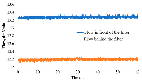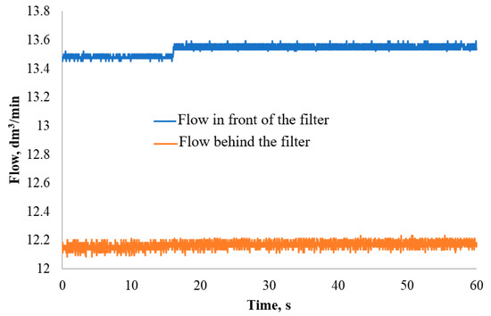 Figure 10 shows the small change in the plot of flow. In this case, it is a cheaper replacement of the monitored filters, whose filtration properties may have lower-quality properties than the original one; a small increase in flow may have occurred due to partial clogging of the filter element. During the continuous measurement, there was no further increase in the flow rate (Figure 10).
