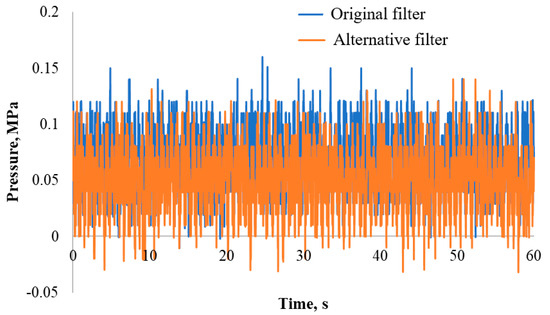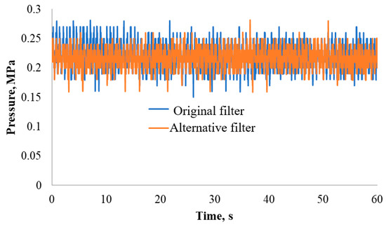 Figure 11 shows the resulting uncontaminated oil pressure values measured on the original MANN W95/26 oil filter and the CNH Industrial 2992242 alternative oil filter at an operating oil temperature of 30 °C in the reference circuit.