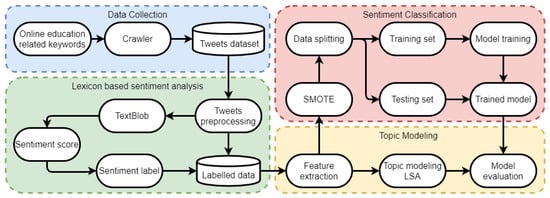 The study [] compares the efficiency of the online education system with traditional classrooms with a focus on students enrolled in higher education. Research suggests that 73 percent of students have appropriate internet access and 71.4 percent of students feel well equipped to operate a computer/laptop for online classes. However, 78.6 percent of respondents believe that traditional classrooms are more effective than online learning. Althagafi et al. [] investigate sentiment analysis of tweets to grasp better understanding of people’s sentiments and opinions about online education in the mid of COVID-19. The study performs experiments using NB (Naïve Bayes), KNN (K-Nearest Neighbour), and RF (Random Forest) classifiers. In comparison to NB and KNN, the RF multi-class classification technique shows the best classification accuracy due to its ability to work well with high-dimensional data such as text categorization. Hogenboom et al. [] proposed a model that accurately classifies the sentiments into positive, negative, and neutral. Furthermore, three basic approaches are used for sentiment analysis. First, a lexicon-based approach is used in which the sentiment lexicon is to describe the polarity and subjectivity score of textual data into positive, negative, and neutral. Machine learning algorithms are easy to implement and understand but require human efforts for labeling. Secondly, the machine learning-based approach requires labeled data to train the classifier manually for better performance. Three, a hybrid approach is a combination of machine learning and a lexicon-based approach.