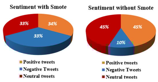 SMOTE (Synthetic Minority Oversampling Technique) is used to solve the imbalanced dataset problems by balancing the number of samples for all the classes of a dataset []. Balancing is achieved by generating synthetic samples of minority classes so that the number of minority class samples becomes almost equal to that of the majority class. The ratio of sentiments after applying the TextBlob is not equal so models can be over-fit on the imbalanced dataset. To avoid this over-fitting problem, SMOTE is used to balance the dataset by generating artificial data for the minority class. The ratio of sentiments before and after applying SMOTE is shown in Figure 2.