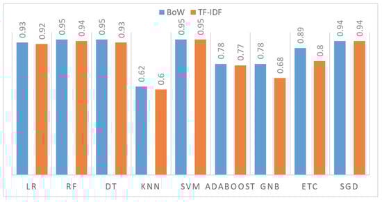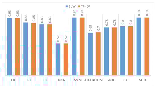 Comparative analysis between results of BoW and TF-IDF indicates that there is no significant difference in the performance of machine learning models when models are trained using BoW or TF-IDF features on the original dataset that contains a different number of samples for three classes. The similarity in models performance can be seen in Figure 3, which indicates that the difference in the performance of RF and AdaBoost is marginal while LR, DT, KNN, SVM, GNB, ETC, and SGD are the same. Similarly, Figure 4 shows comparative accuracy of the models using BoW and TF-IDF features from SMOTE balanced data. Although the performance is improved substantially, the difference in the performance is little between BoW and TF-IDF features except for GNB, where accuracy with BoW and TF-IDF is 0.78 and 0.68, respectively.