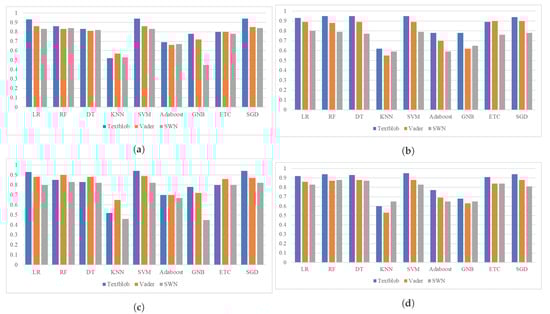 Models’ performance comparison using Textbob, VADER, and SentiWordNet techniques, (a) with BoW features on the original dataset; (b) with BoW features on the SMOTE balanced dataset; (c) with TF-IDF features on the original imbalanced dataset; and (d) with TF-IDF features on the SMOTE balanced dataset.