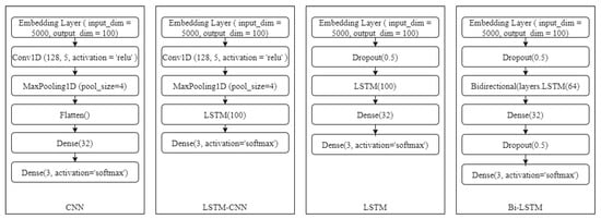 This section contains the results of deep learning models with each lexicon technique. Table 19 shows the results of all models which reveal that deep learning models show superior performance with TextBlob sentiments as compared to VADER and SentiWordNet. For experiments, LSTM, CNN (Convolutional Neural Networks), CNN-LSTM [], and Bi-LSTM Bi-directional-LSTM) are utilized in this study. The implementation details of these deep learning models are given in Figure 6. All the models are compiled using the ‘categorical_crossentropy’ loss function because of the multi-class dataset and the ‘Adam’ optimizer is used for optimization. The models are fit using 200 epochs and 32 batch sizes. Results suggest that, on average, Bi-LSTM outperforms all models with Textblob sentiments by achieving the highest 0.94 accuracy score. Bi-LSTM is significant with each lexicon technique. The performance of the LSTM is marginally low with 0.94, 0.91, and 0.85 accuracy scores with Textblob, VADER, and SentiWordNet, respectively.