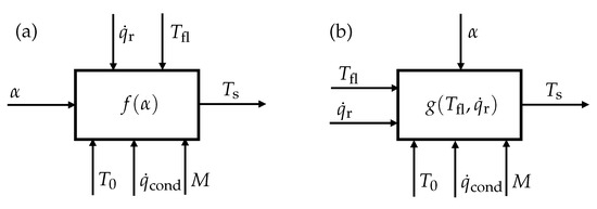 Model function of the surface temperature with input and output quantities and cross-sensitivities, (a): Flow-dependent heat transfer coefficient as input quantity, (b): Analysis of the response behaviour for changing heat inputs, the flow properties in are considered as a parameter of the system’s input–output relation (cross-sensitivity).