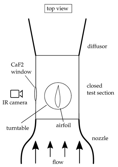 In order to investigate the potential of the presented signal-processing approaches, measurements at Deutsche WindGuard’s aeroacoustically optimized wind tunnel (DWAA) in Bremerhaven, Germany are conducted. The Göttinger-type wind tunnel operates with a closed test section with turbulence intensities of less than 0.3% at wind speeds of up to 100 . The test section has a dimension of × × 5 . The aerodynamic models, with a maximal chord length of up to , are vertically mounted between two turntables at the ceiling and the floor of the test section, which allows for adjusting different angles of attack. The thermographic camera is positioned on the side of the wind tunnel test section, facing the measurement object through a window made of calcium fluoride. Figure 3 illustrates the experimental setup. Note that the friction in the wind tunnel due to operation is the only external heat source and leads to an increasing fluid temperature during the measurements. In addition to the large-scale fluid temperature gradient, there are small-scale fluid temperature oscillations that are probably a result of variations in the fan power. Due to the inertia of the power control, the oscillations are mainly in a low-frequency range from 0 to 0.2 .