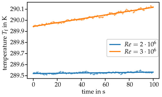 For , the wind tunnel heating rate is about 0.01 , which leads to a low thermal contrast and short compensation time to achieve the desired near-thermodynamic steady state of the measurement object. For a , a transient input signal is realised by a fluid temperature ramp with a heating rate of about 0.1 .