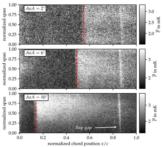 In order to estimate the position of the laminar-turbulent flow transition for the presented experiment with , the thermographic detectable movement of the transition position for the measurements with the angle of attack of 2°, 6° and 10° is used as a reference. As shown in Figure 7, the transition position moves from for to for . As a result, the position of the laminar-turbulent transition is expected to be near the leading edge for .