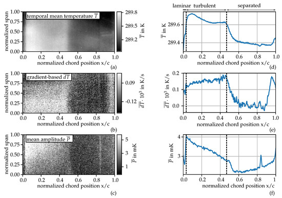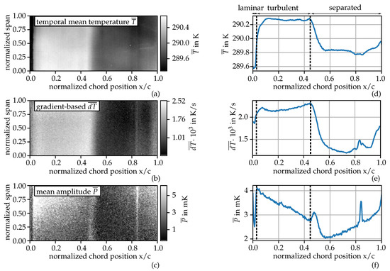For this purpose, the image processing results of the mean temperature (classical approach) as well as the novel gradient-based and the around-an-operating-point signal processing approach are shown in Figure 8 for the flow condition . Figure 8a–c show the output images in order to analyse the distinguishability between the different flow regions. The averaged profiles over the normalized chord position are shown in Figure 8d–f with the aim of identifying flow-dependent features.
