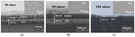 SEM top view and cross section images of N-UNCD films grown at: (a) 80 mbar and 4500 W, (b) 90 mbar and 4500 W, (c) 100 mbar and 4500 W.