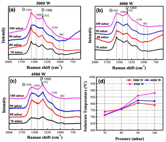 Raman spectra of N-UNCD films grown at: (a) 3000 W (70–100 mbar); (b) 4000 W (70–100 mbar); (c) 4500 W (70–100 mbar); (d) Graph of the substrate temperature vs. film grown pressure.