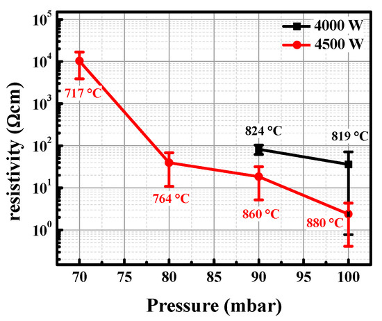 The total pressure was varied between 70, 80, 90, and 100 mbar while the microwave power was maintained at 3000, 4000, and 4500 W for each experimental series, respectively.