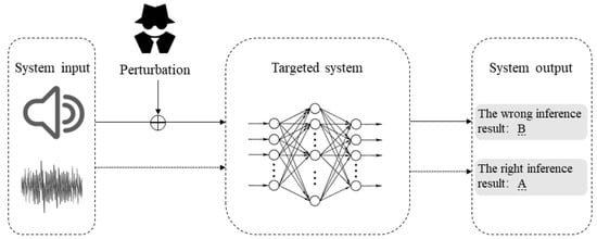 Figure 1 illustrates the general working flow of an adversarial attack in voice processing systems. The correct result of the original audio passing through the target system is A, while the attacker adding perturbation to the original audio will make the target system achieve the wrong result B, and B is different from A which means the attack has an outstanding performance.