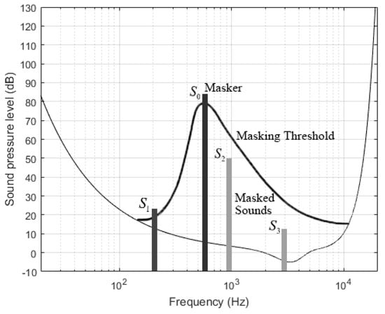 - Frequency Masking. Frequency masking implies masking between two sounds of close frequency, where a low-level maskee is inaudible by a simultaneously occurring louder masker. In simple terms, the masker can be seen as creating a “masking threshold” in the frequency domain. Any signals which fall under this threshold are effectively imperceptible. Figure 2 gives a vivid example of simultaneous masking, where sound is the masker. Because of the presence of , the threshold in quiet is elevated to produce a new hearing threshold named the masking threshold; in this example, the weaker signal and are entirely inaudible, as their sound pressure level is below the masking threshold.
