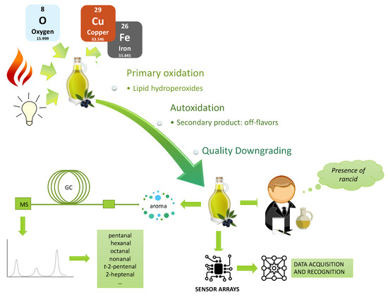 The exposition of VOOs to oxygen or catalyst agents induces the oxidation of unsaturated fatty acids, with the formation of unstable hydroperoxides, which, during autoxidation, form off-flavors (secondary volatile products such as aldehydes, ketones, alkenes and alkanes) responsible for the VOO quality decay.