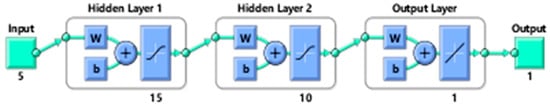 The best-developed model has two hidden layers with 15 and 10 neurons, respectively (i.e., 5-15-10-1). In addition, the TANSIG-TANSIG transfer functions and the linear transfer function (Pureline) for the output layer were recommended to be used. Moreover, among different algorithms that were checked, the Levenberg–Marquardt (LM) algorithm was recommended for this network [29]. The network topology of the proposed model is presented in Figure 1.
