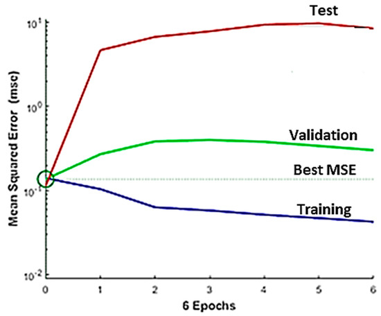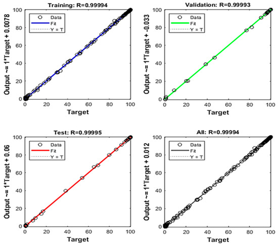 By the “nntool function” in MATLAB 2021a, developed by MathWorks Inc., Natick, Massachusetts, USA, the experimental datasets used for the training stage were divided randomly into three sets: 70% for training, 15% for validation, and 15% for testing.