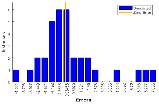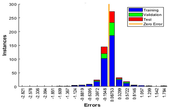 Furthermore, Figure 4 shows the error histogram for the training dataset, which is drawn across the zero error. The error lies only in a narrow range (−1.609 to 1.784), which also indicates the good performance of the proposed ANN model.