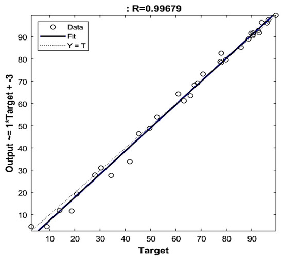 Table 5 shows the parameters of the developed ANN model, and the “goal” was the mean square error (MSE), which was set to zero. Figure 3 shows the performance plot through the training, validation, and test errors when predicting the experimental values. The testing was stopped when validation error increased consecutively for six epochs. In this case, an optimum value of MSE (MSE = 0.13715) was obtained. This value is very small and additionally proves the good prediction performance of the developed model [30,31,32].