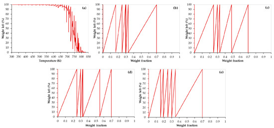 The results presented in Table 8 and Table 9 imply that temperature is the most sensitive parameter, which is in a good agreement with the results reported by Kempel et al. [46]. Temperature is a key parameter that contributes to the energy needed to transform a unit mass of solids to volatiles [47]. Figure 7 presents the variation in the pyrolysis output parameter (weight left percent) with input parameters. Although the temperature has a clear inverted sigmoid function relationship with weight left percent (Figure 7a), other parameters have no clear correlation with the output parameter (Figure 7b–e).