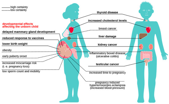 So far, a substantial number of studies have proved many adverse effects of PFASs on human health. PFOS and PFOA, at concentrations of the order of few micrograms per liter in blood, may cause hypercholesterolemia, ulcerative colitis, thyroid disease, cancer, pregnancy-induced hypertension, pre-eclampsia, and liver damage. For each of these outcomes, a molecular mechanism has been tentatively proposed. In this regard, one of the most comprehensive collections of epidemiological studies linking adverse human health effects and many other problems to PFASs (particularly PFOA) is still under investigation and is authored by the C8 Science Panel [4,16]. Figure 1 summarizes the diseases already confirmed to be associated with PFAS substances.