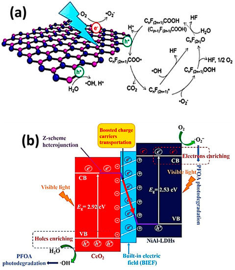 PFOA degradation mechanism over (a) boron nitride (reprinted from [97], copyright (2020) with permission from ACS publications) and (b) the z-scheme based heterojunction of core–shell CeO2@NiAl-LDHs (reprinted from [99], copyright (2021) with permission from Elsevier).