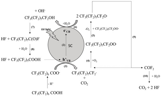 - Qu, Y.; Zhang, C.; Li, F.; Chen, J.; Zhou, Q. Photo-reductive defluorination of perfluorooctanoic acid in water. Water Res. 2010, 44, 2939–2947. [Google Scholar] [CrossRef] [PubMed]